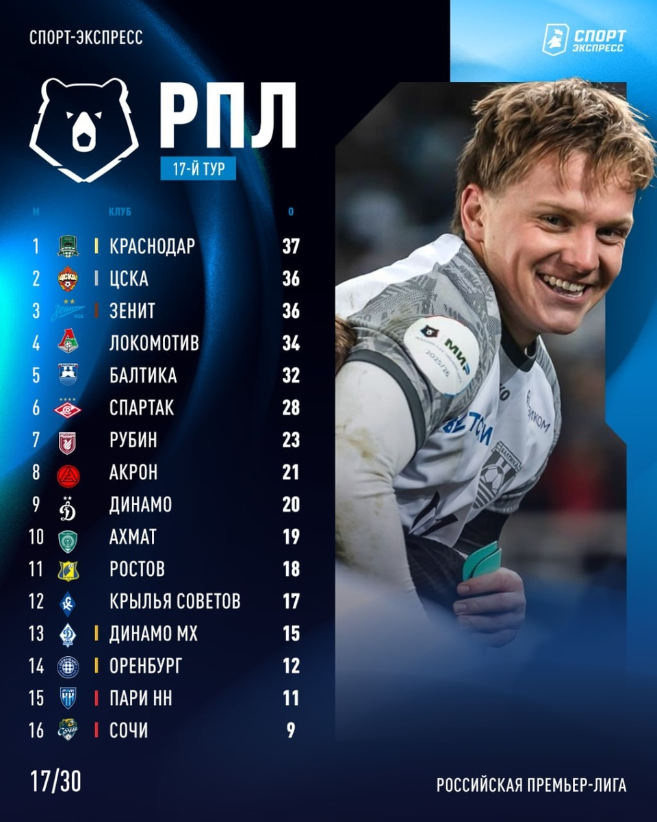 Приветствую уважаемые болельщики. 29-30 ноября - 1 декабря прошел 17 - й тур РПЛ: Акрон - Пари НН 1-2 прогноз 2-0. Дзюба забил гол престижа. В густом самарском тумане Акрон увидел призрак своего недавнего прошлого. ЦСКА - Оренбург 2-0 прогноз 2-0. В РПЛ ЦСКА на своем поле ни разу не проиграл, всего в 15 матчах этого года команда одержала 13 побед и 2 раза сыграла вничью. Балтика - Спартак 1-0 прогноз 1-1. Мясные пропустили играя час в большинстве. Краснодар - Крылья Советов 5-0 прогноз 3-1. Кордоба 1+1 и Сперцян 2+1. КС проиграли быкам в этом сезоне 0-11! Ахмат - Динамо 2-1 прогноз 2-1. Волевая победа усатого. Ростов - Локомотив 1-3 прогноз 2-2. Зенит - Рубин 1-0 прогноз 3-1. Сочи - Динамо Мх 0-0 прогноз 3-2. Табличка после 17-го тура: Лучшие по системе гол+пас:: Сперцян (Армения, Краснодар) 19 (8+11), Батраков (Локо) 15 (10+5), Глушенков (Зенит) 12 (8+4), Кордоба (Колумбия, Краснодар) 11 (7+4). (Албания, Рубин) 10 (9+1), Хиль (Сальвадор, Балтика) 9 (8+1), Обляков (ЦСКА), Бителло (Б