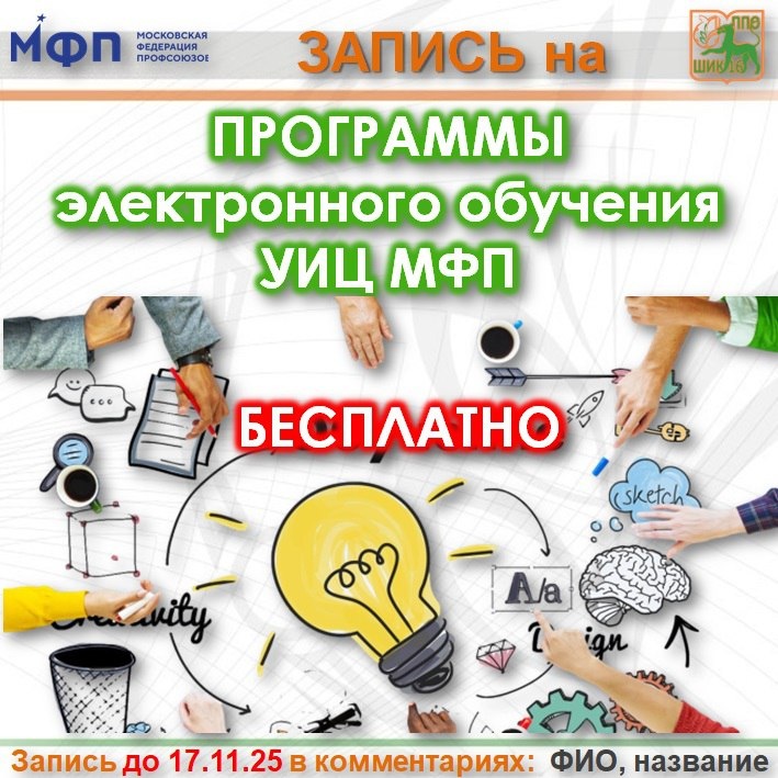 📣ВНИМАНИЕ! БЕСПЛАТНО! 💥ЭЛЕКТРОННОЕ ОБУЧЕНИЕ. Удобный формат, получение сертификата! Программы электронного обучения УИЦ МФП: - Повышение эмоциональной компетентности - Мастерство публичной речи - Искусство мирного диалога - Технология развития ключевых качеств лидера - Стратегия продвижения профсоюза в информационном пространстве - Основы охраны труда ‼️‼️‼️ Заявки принимаются до 17 ноября 2025 г/СЕГОДНЯ Обучение начнется: с 19 января по 30 января 2026 г. (запуск программ будет осуществляться поэтапно). Прослушать курс возможно до 27 марта 2026 г. После прослушивания программ и заполнения тестов, сертификат будет автоматически сформирован в личном кабинете. ‼️Запись через председателя ППО
