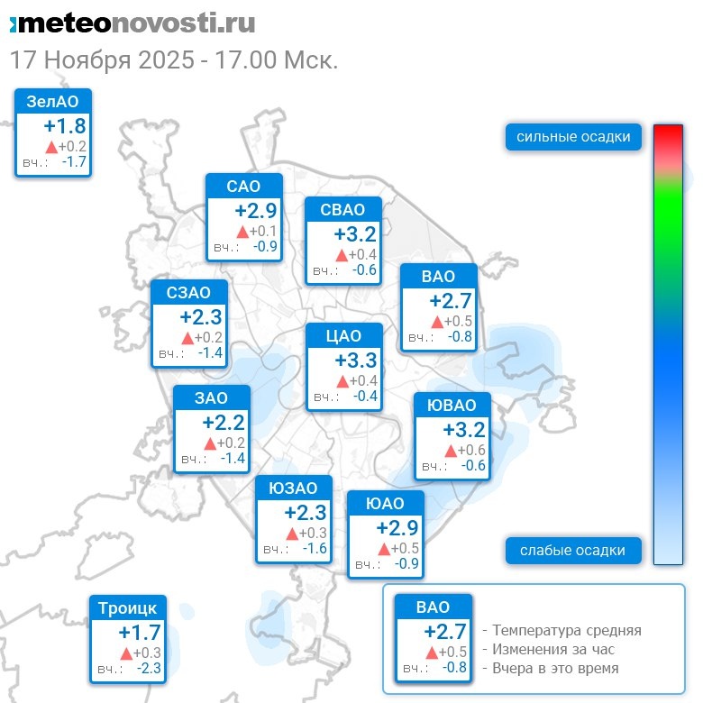 В 17:00 в Москве было от +1.3°C до +3.4°C, средняя температура +2.7°C #погода #Москва #осень #температура #17ноября #понедельник Перейти на сайт Прогноз погоды на 14 дней