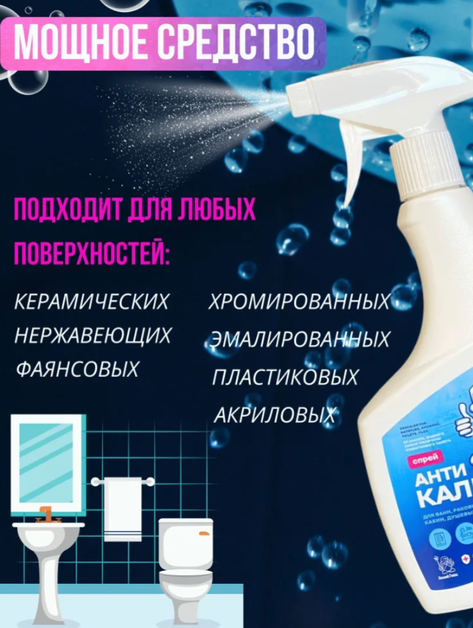 Ванная комната — место, где скапливается известковый налет, ржавчина, водный камень и мыльные разводы. Традиционные средства требуют усилий: натереть, подождать 10–15 минут, а потом еще и оттереть остатки. А если поверхности вертикальные или большие, как плитка на стене, — вообще кошмар! «АнтиКальций» решает эту проблему радикально. Это универсальное средство для комплексной уборки: подходит для ванн и душевых кабин, раковин, сантехники, плитки, стеклянных и фаянсовых изделий. Одно применение — и прощай, грязь! Оно удаляет даже самые сложные загрязнения: известковый налет, подтеки ржавчины, водный камень, грязь и мыльные разводы.