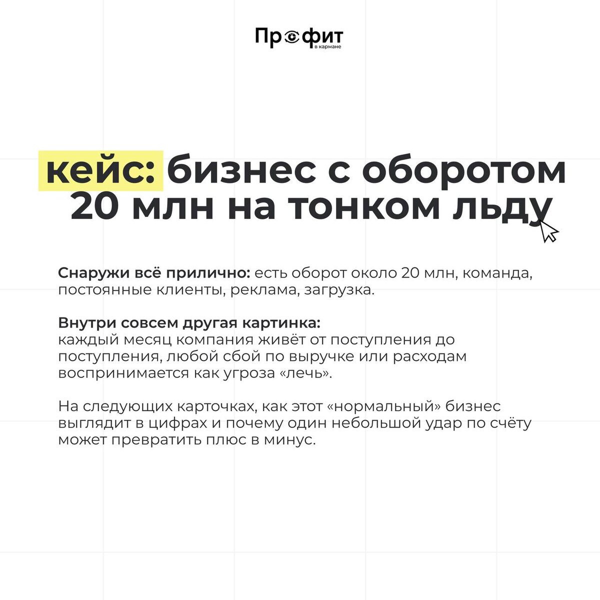 20 млн оборота, а шаг в сторону и бизнес шатает У многих владельцев сейчас одна и та же ситуация. Снаружи нормальный живой бизнес: есть выручка, команда, клиенты. Внутри понимание, что шаг влево, шаг вправо по выручке или расходам сразу бьёт по выживаемости. Чуть просела выручка. Чуть подрос ФОТ, аренда, реклама. И месяц, который должен был быть «в плюс», превращается в «как бы дотянуть и никому не задолжать». Это и есть признак хрупкой финансовой модели: неважно, сколько вы делаете оборота, важно, насколько система выдерживает отклонения от плана. В карусели — конкретный кейс бизнеса с оборотом около 20 млн. На цифрах видно, как небольшие изменения по выручке и затратам разворачивают формальный плюс в убыток. На интенсиве «Финансовая броня предпринимателя 2026» мы берём такие ситуации как отправную точку и за три дня по шагам собираем для владельца финансовую броню: • День 1 — пересматриваем расходы так, чтобы убрать лишнее и получить запас прочности, не ломая систему. • День 2 —