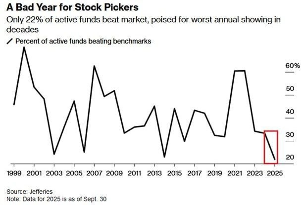 Stock Pickers' Worst Year in Decades 🚨 Only 22% of active funds managed to beat the market in 2025—yep, the worst in at least 26 years! 😱 That means almost 80% of pro fund managers are lagging behind good ol' index funds. As the legend Jack Bogle said: Why chase that needle in the haystack? Just grab the whole haystack! 🐴💰 Looks like passive investing flexed its muscles again—alpha's expensive, but beta knows how to win! 💪📈
