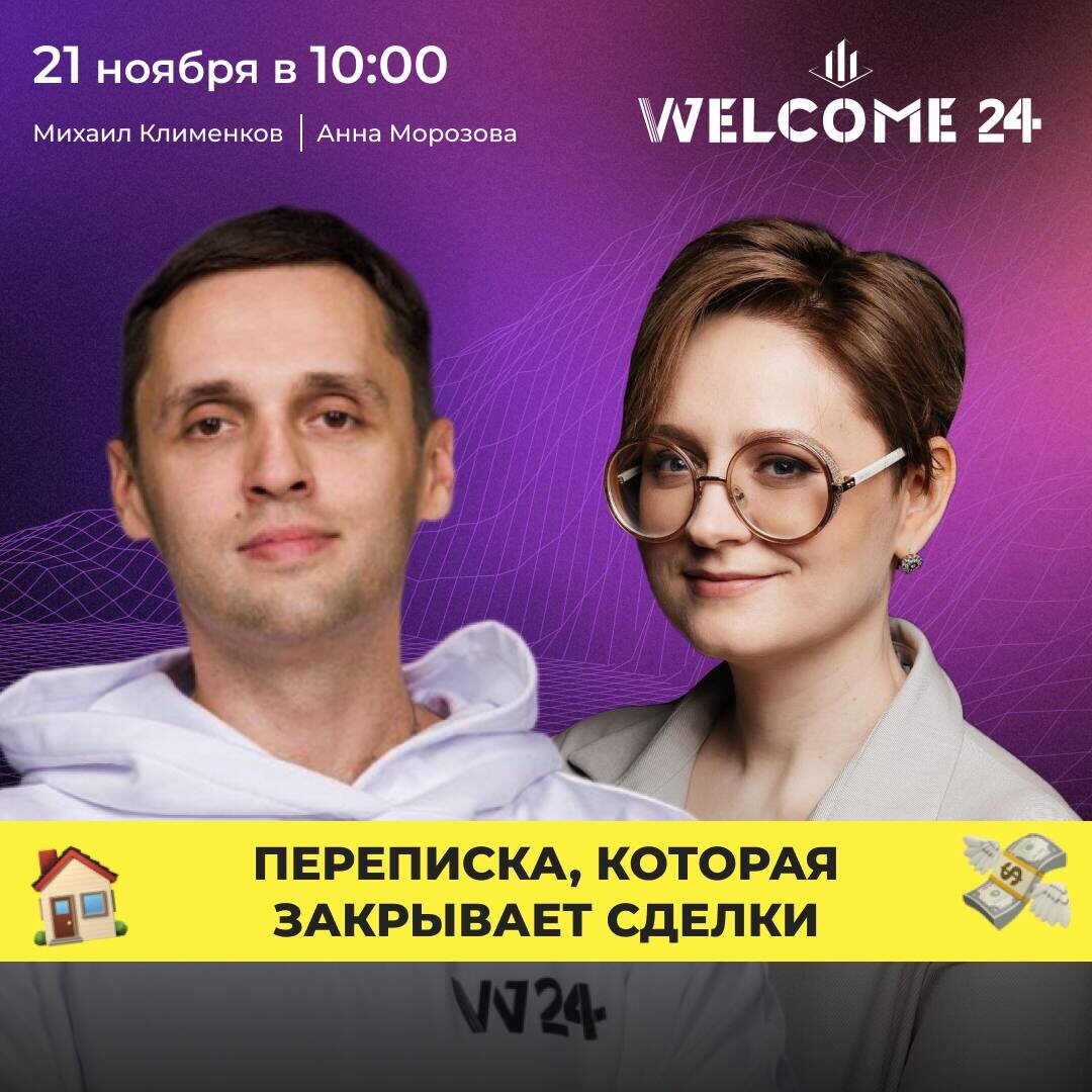 🔥 Агенты, которые зарабатывают больше — просто переписываются иначе. 21 ноября в 10:00 разберём одно из самых недооценённых умений на рынке недвижимости — переписку, которая реально продаёт. В прямом эфире вы узнаете: 🔹Как вести диалог так, чтобы клиент сам хотел перейти на звонок или встречу. 🔹Какие фразы убивают доверие, а какие моментально создают эффект экспертности. 🔹Типичные ошибки риэлторов в чатах — разбор на реальных кейсах. 🎙 Спикеры: Анна Морозова Эксперт по построению и оптимизации систем продаж в девелопменте и риэлторском бизнесе. Управляющий партнёр консалтинговой группы BGO. В отрасли с 2005 года. Михаил Клименков CEO и сооснователь онлайн-агентства недвижимости WELCOME 24. 📅 Пятница, 21 ноября ⏰ 10:00 по Москве 🔗 Ссылка на эфир будет в канале WELCOME 24 перед стартом трансляции👉 https://t.me/welcome24agency