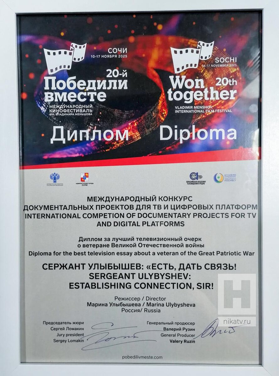⚡️ Фильм сотрудницы «Ники» стал лауреатом ХХ Международного кинофестиваля «Победили вместе» «Сержант Улыбышев: “Есть, дать связь!”» стал лучшим телевизионным очерком. Напомним, что всего на фестивале было более 100 картин из Китая, Турции, Италии, Франции, Швейцарии и других стран. В конкурсе докфильмов соревновались 30 фильмов. 👏 Для картины сотрудницы «Ники» Марины Улыбышевой это был яркий дебют. Посмотреть кино можно тут. Поздравляем! 📺 Подписывайся на наш канал в Максе