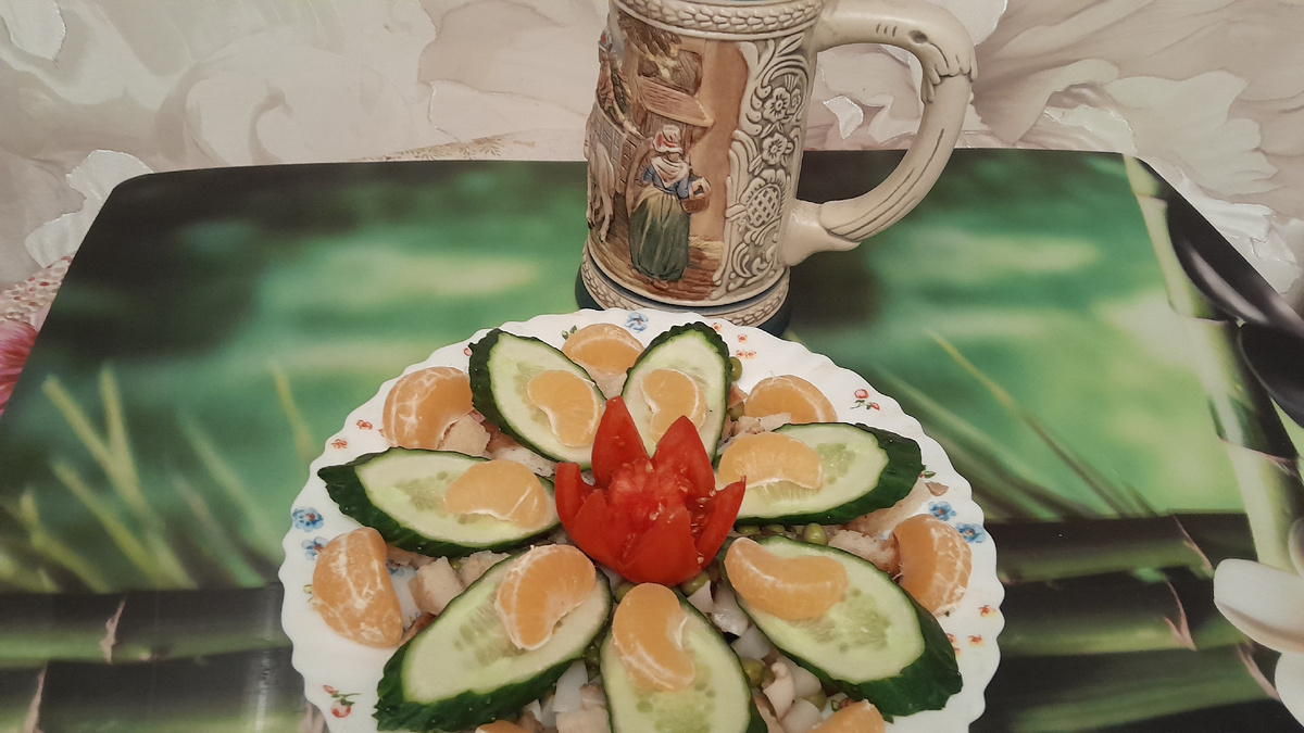 Всем привет! Готовимся к Новому Году! Вашему вниманию - блиц-рецепт салата из маринованных грибов. Подписывайтесь на мой канал, ставьте лайки. Ингредиенты: Маринованные грибы - 200г Зелёный горошек - 200г 5 ломтиков батона Растительное масло - для заправки Огурец, помидор - для украшения. Маринованные грибы - мелко режем: Выкладываем в большую чашку: Разогреваем в сковороде растительное масло: Белый батон обжариваем с двух сторон: Получившиеся гренки остужаем: Режем кубиками: Перекладываем в большую чашку: Ааа Салат хорошо перемешиваем, можно немного подсолить. Добавляем 2-3 столовых ложки растительного масла, снова перемешиваем. Украшаем овощами, фруктами. Этот салат хорош без майонеза и прочих соусов, очень прост в приготовлении. Смотрите на моём канале: Салат из осьминогов: Овощи-гриль в микроволновке: Грибы из баклжанов: Бааклажаны фаршированные: Тыква фаршировнная мясом: