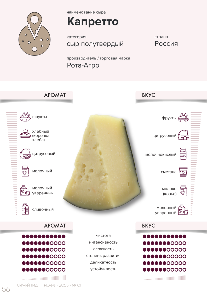 Подобные сыры намного реже встречаются на полках супермаркета или сырной лавки. Из-за чего пробовать и анализировать их становится еще интереснее. Сыр с чистой и интересной ароматикой, но с легким дисбалансом во вкусе и выраженной кислотностью (возможно особенность данной партии сыра). Аромат сыра чистый, средней интенсивности, с доминированием фруктов, хлебной корочки / бриоши, цитрусовых и нюансами – молочным уваренным, сливочным. Вкусовой профиль сыра чистый, умеренно интенсивный. Сыр оставляет хорошее впечатление, чистый ароматический и вкусовой профили, с узнаваемым овечьим нюансом и привлекательной творожисто-текучей консистенцией. Во вкусе характерные для срока зрелости горчинка и острота от корки сыра. Сыр мягкий, консистенция сыра однородная, нежная, упругая. При нежной сырной мякоти корочка плотновата. Легкий козий нюанс ощущается только во вкусе, и не проявляется в аромате. Плотная корочка сыра контрастирует с нежной серединой. Вариант употребления - в качестве снека. Подпи