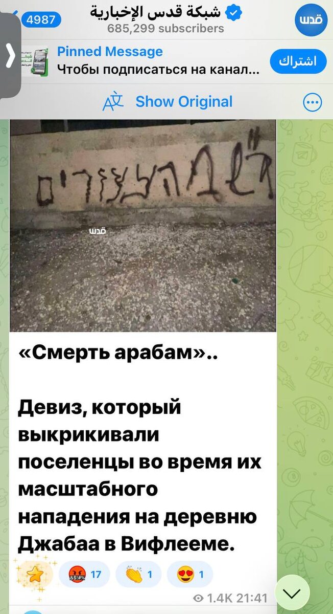 Но у каждой медали есть и обратная сторона. Палестинцы разгоняют волну, утверждая, что молодые поселенцы расписали стены призывами к смерти арабов и постят эту картинку. На ней неровным подчерком написано "привет от отморозков" Или от буйных, тут кому как нравится. Слова арабы или смерть тут не наблюдается...