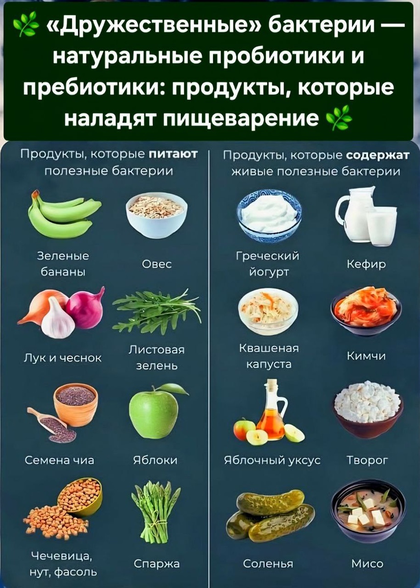 🤗 Дорогие мои девочки, давайте поговорим о «дружественных» бактериях, которые живут в нашем организме и помогают нам оставаться здоровыми и красивыми! 🌿 Эти маленькие помощники — пробиотики и пребиотики — играют ключевую роль в поддержании баланса микрофлоры, укреплении иммунитета и улучшении общего самочувствия. ✨ Пробиотики – это живые полезные бактерии, которые приносят пользу нашему организму. Они улучшают баланс микрофлоры в кишечнике и помогают переваривать пищу. 🧀 Где найти пробиотики? • Кисломолочные продукты: йогурт без добавок, кефир, ряженка • Ферментированные овощи: квашеная капуста, кимчи, соленья (огурцы, ферментированные в рассоле) • Сыры: твёрдые сорта, такие как пармезан, гауда, чеддер и моцарелла • Ферментированные соевые продукты: мисо и темпе • Хлеб на закваске, оливки – также помогут улучшить микрофлору. 🥖🫒 ✨ Пребиотики – это пищевые волокна, которые служат «питанием» для пробиотиков.Они не перевариваются в желудке, но стимулируют рост и активность полезных