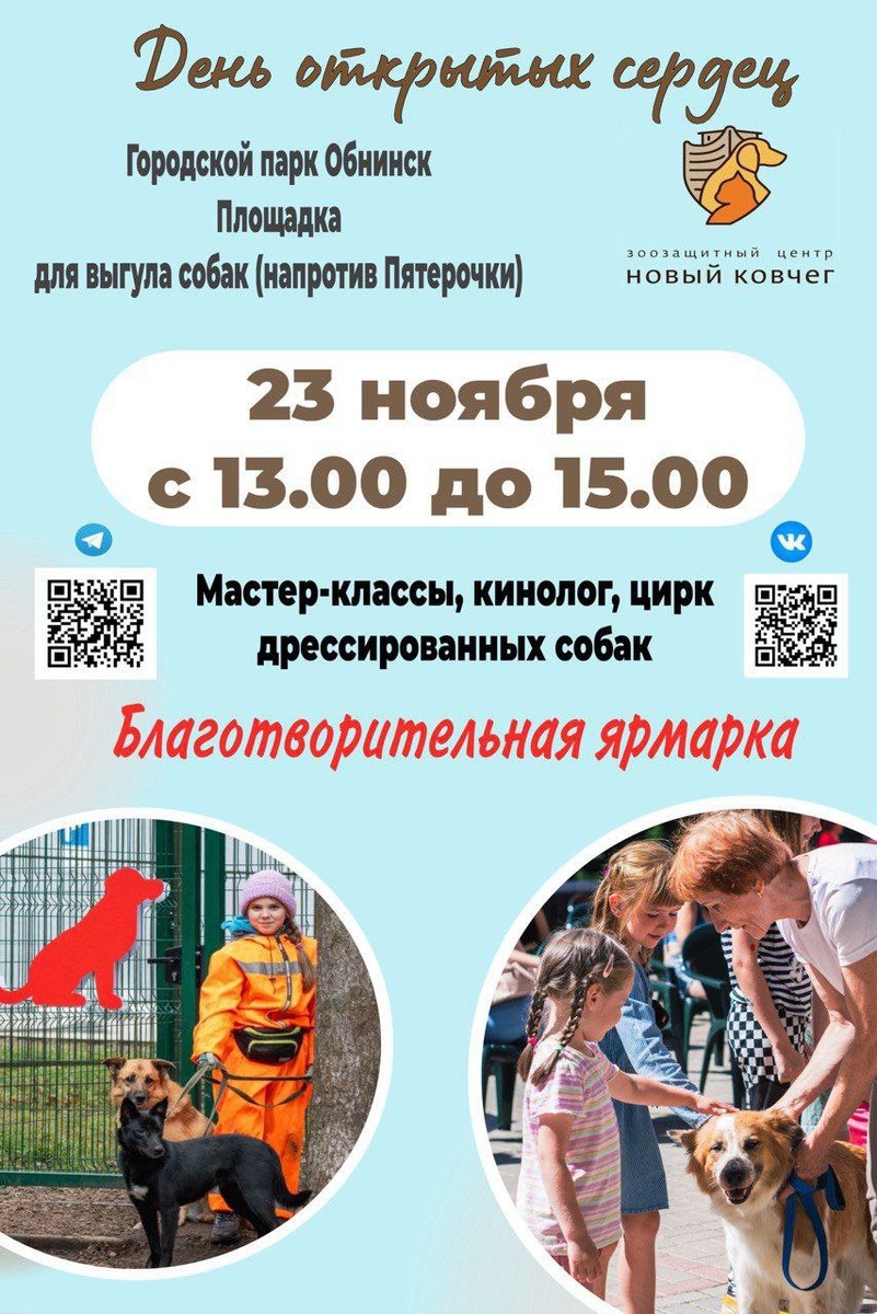 ДЕНЬ ОТКРЫТЫХ СЕРДЕЦ 23 ноября 2025 года с13.00 до 15.00 в ВОСКРЕСЕНЬЕ в Городском парке г.Обнинск. 🥰Ждём взрослых и детей! Предварительная программа: 📌13.00 слово директора Нового Ковчега, Анны Могильнер 📌 13.30-14.30 Цирк дрессированных собак; мастер-классы для детей и взрослых, кинолог, викторина с призами. 🩷Вы сможете пообщаться с собачками из приюта Новый Ковчег, а также взять собаку на небольшую прогулку. 📌С 14.30-чаепитие с вкусняшками 🐾Будет работать БЛАГОТВОРИТЕЛЬНАЯ ЯРМАРКА, все вырученные средства с которой пойдут на ремонт будок и вольеров приюта для бездомных животных Новый Ковчег. В парк можно будет принести нужные подарки для хвостиков приюта!