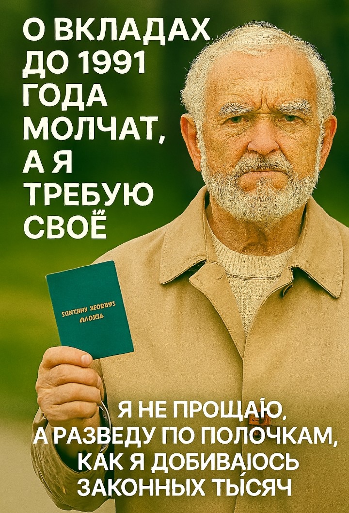 О вкладах до 1991 года молчат. А я не собираюсь молчать Мне 75 лет. Я пенсионер. Я всю жизнь работал — на заводе, потом в техникуме, потом охранником. Я откладывал деньги, как учили: «Копи на чёрный день». Я открыл вклад в Сбербанке в 1988 году. Положил 3 000 рублей — по тем временам это были серьёзные деньги. Я не тратил, не снимал, берег. А потом пришли 90-е. Инфляция, реформы, деноминация. Мои деньги исчезли. Мне сказали: «Ждите компенсации». Я ждал. Тридцать лет. Остались вопросы ! Подписываемся на наш Телеграм И всё это время — тишина. Ни писем, ни звонков, ни уведомлений. Государство молчит. Сбербанк молчит. А я — живу на пенсию, считаю копейки, и знаю, что мои деньги где-то лежат. Я не собираюсь молчать. Я хочу вернуть своё. Я вспомнил о вкладе случайно. Разбирал старые бумаги, нашёл сберкнижку. Пожелтевшая, с печатью, с записями. Остаток — 3 000 рублей. Я показал её сыну. Он сказал: — «Пап, это же до 1991 года. Тебе положена компенсация». Я не поверил. Я думал, что всё давн