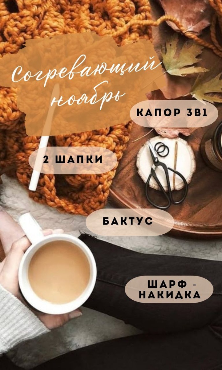 Ноябрь, который вас согреет💫 Делюсь тем, что подготовила для вас в ноябре. Каждую модель подбирала тщательно: только практичные, стильные и по-настоящему «рабочие» вещи, которые приятно носить и еще приятнее вязать, каждая со своей изюминкой! Для тех, кто захочет собрать все новинки сразу и получить максимальную поддержку, откроется отдельный чат «Согревающий ноябрь»🍁 Там вас будет ждать не только самая выгодная цена на старте, но и чат поддержки, где можно задать вопросы, обсудить процесс, вдохновиться и быть в компании единомышленниц Все мастер-классы также можно будет приобрести по отдельности, по мере выхода они появятся на сайте. 🤍Вязальное меню ноября Видео мастер-классы: • Шапка базовая - бини • Шапка с ушками • Капор (расчет на взрослый и детский) • Декор рыцаря для капора • Корона — как отдельная повязка или элемент декора PDF-схемы: • Бактус • Шарф - накидка ⏰Старт канала — 25 ноября (во вторник) На этой неделе расскажу подробнее об изделиях, а также открою раннюю рег