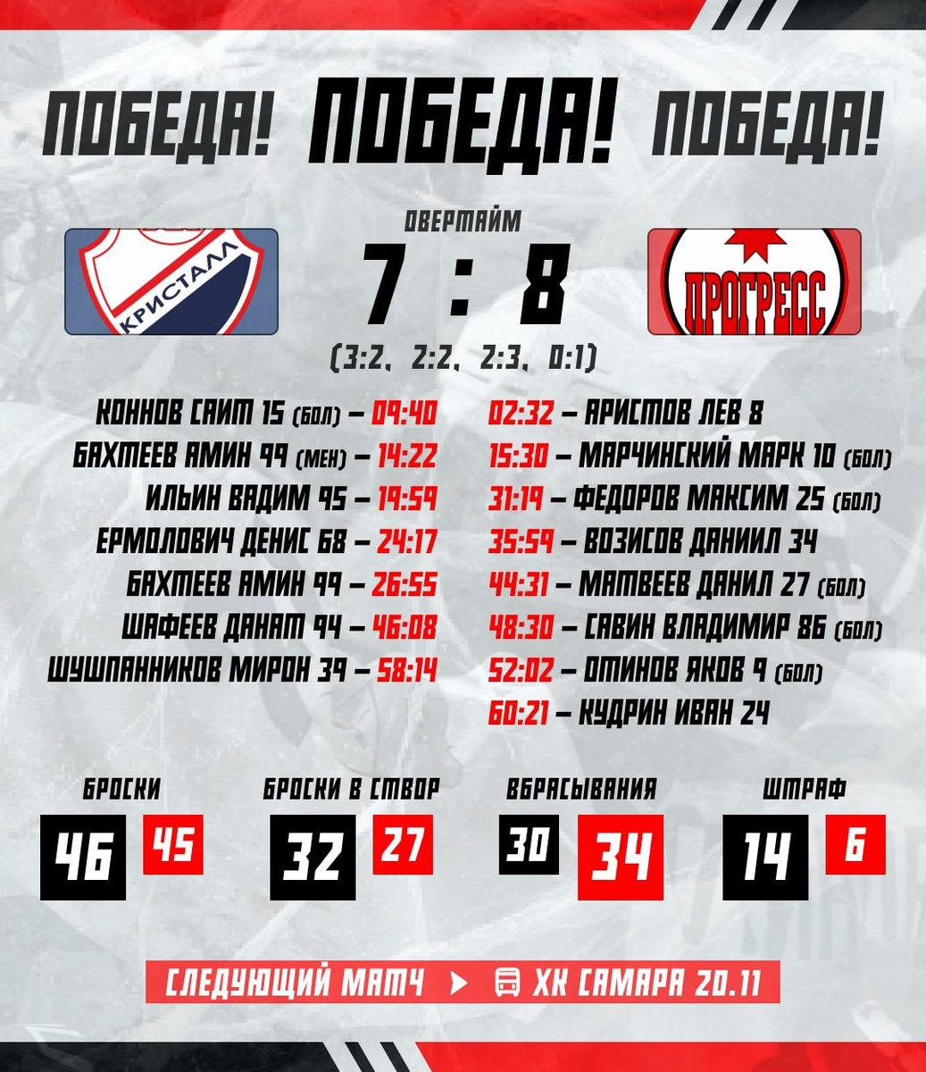 🔥 Невероятная голевая феерия в Саратове 🔥 Сегодня наши хоккеисты подарили зрителям настоящий праздник! 🏒✨ Матч завершился фантастическими цифрами: 15 заброшенных шайб, захватывающий овертайм и решающая победная шайба нашего лидера и капитана команды — Ивана Кудрина! Мы снова доказали, что команда "Прогресс" способна на настоящие чудеса! Благодарим всех болельщиков за поддержку и ждем вас на следующем матче, ведь вместе мы непобедимы! 💥⚡️ #Хоккей #Прогресс #Победа