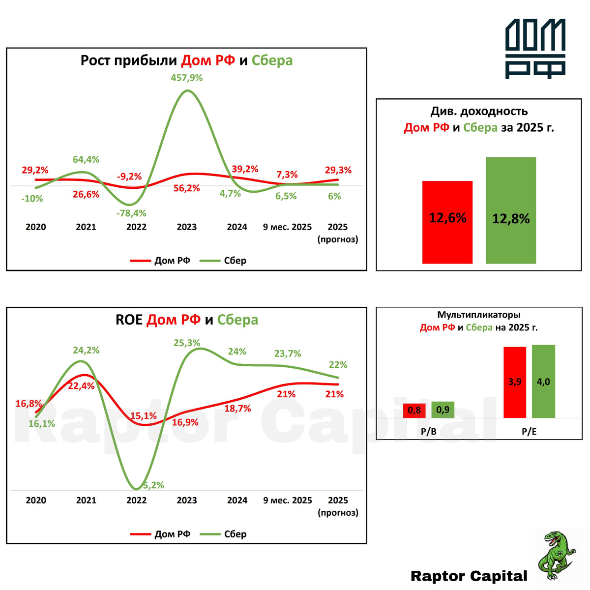 📌 В среду 19 ноября завершается сбор заявок для участия в IPO компании Дом РФ. Судя по оценке компании и её презентациям (сравнивают свои показатели с банковским сектором), в первую очередь нужно сравнивать Дом РФ и Сбер. Делюсь своими результатами сравнения и мнением о привлекательности IPO. • Безусловно, по темпам роста выигрывает Дом РФ – за последние 5 лет среднегодовой рост прибыли на 28,4%. За 9 месяцев 2025 года прибыль выросла лишь на 7,3% год к году, но прогноз менеджмента на весь год +29,3%. У Сбера прогноз +6%, за 9 месяцев уже есть +6,5%. Сравнение роста прибыли на верхнем левом графике. • ROE лучше у Сбера – около 24-25% за последние 4 года (кроме 2022 года по понятным причинам). Дом РФ отстаёт на несколько процентов, за 9 месяцев 2025 года ROE у Дом РФ 21%, у Сбера 23,7%. Сравнение ROE на нижнем левом графике. • По итогам 2025 года Сбер должен выплатить дивидендами более 38 рублей на акцию (див. доходность 12,8%). Дом РФ при выполнении прогноза по прибыли выплатит около