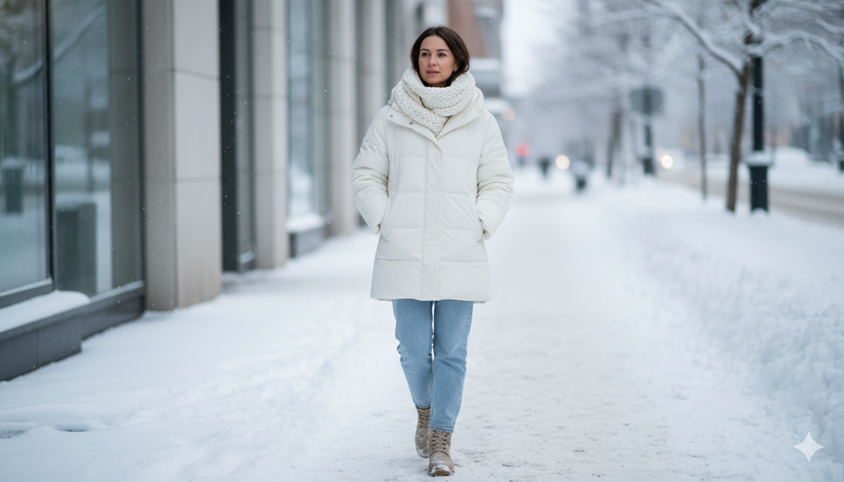 Давайте сегодня спокойно и по-домашнему поговорим про белый цвет зимой. Ту самую тему, которая вызывает и восторг, и сомнения. Кто-то давно носит белое без страха, кто-то только присматривается, а кто-то уверенно говорит: "Нет, это не для меня". Но чаще всего страхи держатся не на фактах, а на мифах. Зимой наша городская палитра превращается в смесь графита, асфальта и угля. Люди по привычке выбирают тёмное, потому что "практично". И на этом фоне белое выглядит как живой свет. Белая одежда зимой - это про дефицит на рынке жизни. Пока весь город в тёмном и жалуется на серость, женщина в белом видна сразу. Она заметна. Она считывается. Белое пальто, пуховик, брюки или обувь создают эффект прожектора. Свет отражается от ткани, лицо выглядит свежее, а образ - дороже. Белый не кричит, но выделяет. Это не пижонство. Это визуальный контраст, который работает безошибочно. Белые вещи зимой будто несут сигнал: "Я здесь".