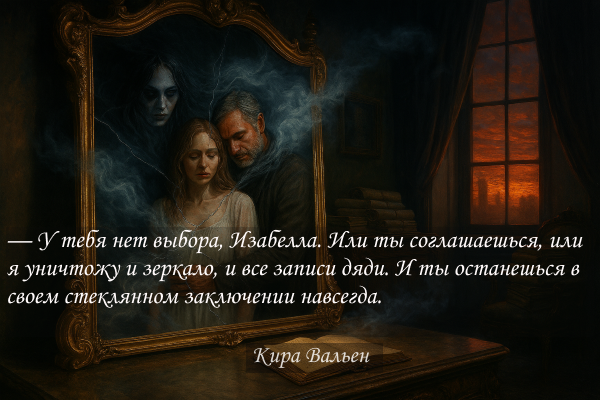 — У тебя нет выбора, Изабелла. Или ты соглашаешься, или я уничтожу и зеркало, и все записи дяди. И ты останешься в своем стеклянном заключении навсегда.