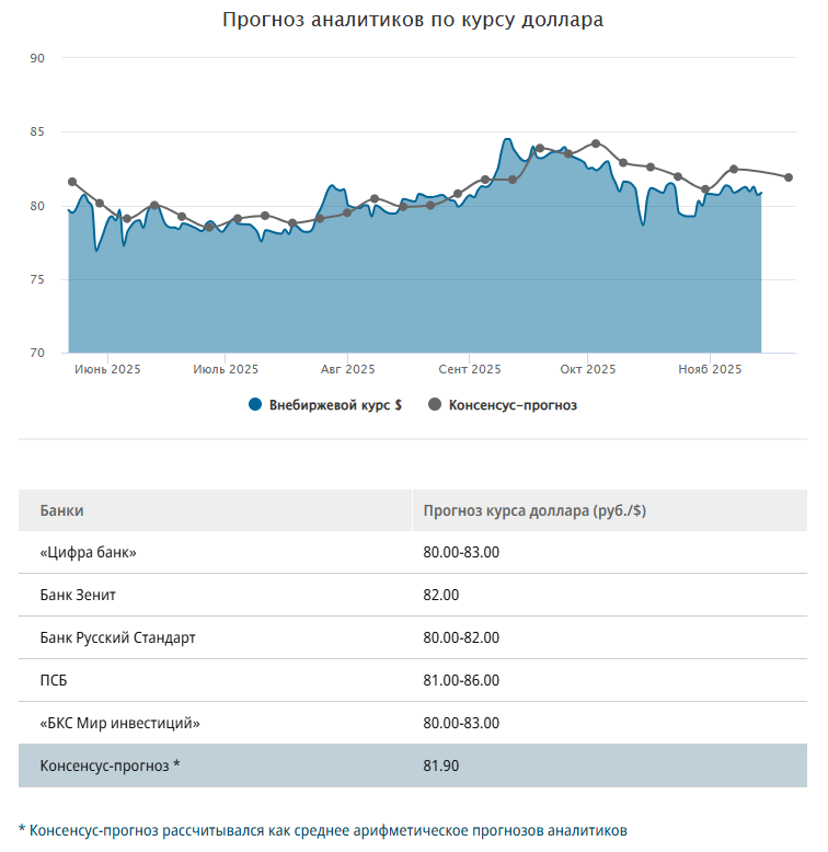 Мнения и прогнозы аналитиков о том, как будет вести себя рубль Волатильность на внутреннем валютном рынке остается пониженной. На протяжении недели внебиржевой курс доллара торговался в узком коридоре 80,3–81,6 руб./$, а по итогам пятничных торгов составил 80,95 руб./$. Таким образом, он остался на уровне закрытия предшествующей недели. Официальный курс доллара, рассчитываемый Банком России, снизился на 10 коп., до отметки 81,1276 руб./$. Аналитики отмечают сохраняющийся баланс спроса и предложения иностранной валюты. Возможно курс будет крепче Рубль упорно держит свои позиции. Он комфортно обустроился в диапазоне 80–82 за доллар, где его защищают высокая ставка, бюджетное правило, экспортная выручка от продажи золота и слабость импорта. Конструкция, с одной стороны, хрупкая, а с другой — она сохраняется уже весь 2025 год. Консенсус ЦБ ожидает ослабления рубля до 94 руб./$ в среднем по 2026 году, Минэкономразвития — до 92,5 руб./$. Возможно, что курс будет крепче. В этом году среднегод
