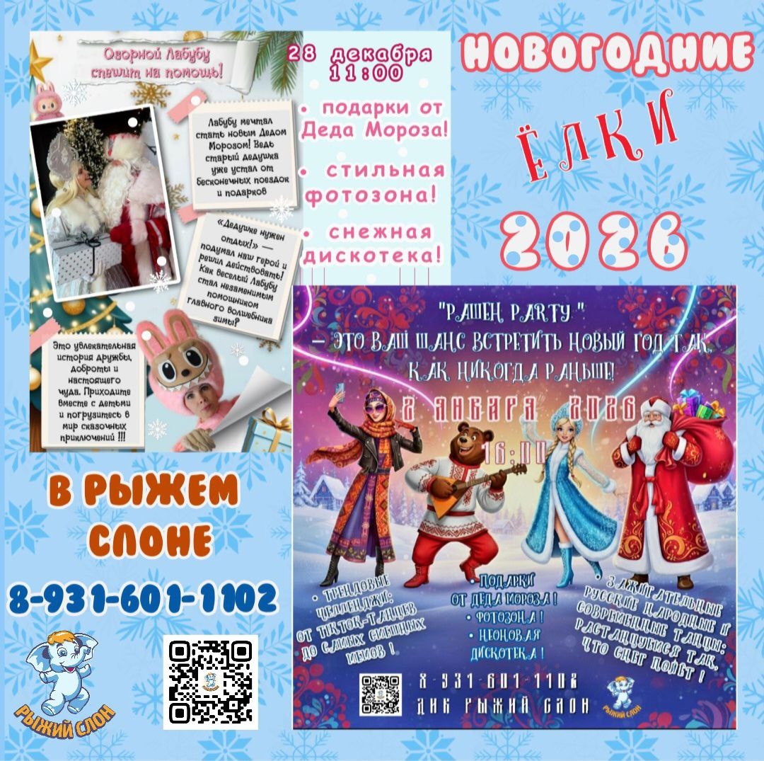 Ёлки 2026 в Рыжем Слоне Как всегда, мы приготовили для вас несколько авторских программ, на любой возраст и вкус! В каждой программе вас ждет: • Весёлая развлекательная программа! • Много игр, музыки и приключений! • Сказочные, и не только, герои! • Главные Новогодние волшебники : Дед Мороз и Снегурочка! • Снежная новогодняя дискотека! • Стильная фотозона для ярких фотографий! • Крутые подарки от Деда Мороза! Подробнее про Елки 2026 можно посмотреть здесь ⬇️ 28 декабря 11:00 "Посох для Лабубу!" 2 января 16:00 "Новогодняя Рашен PARTY!" Бронируйте скорее, пока места еще есть! #новыйгод #елка2026 #елкиКалининград #ёлка_детям_калининград #елкаБалтрайон #новыйгод26 #детскийновыйгод