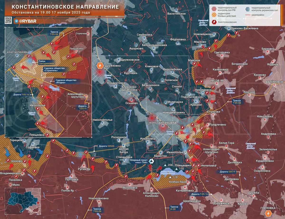 📝На пороге Константиновки📝 Северск — не единственный город, где бои развиваются на подступах. В районе Константиновки на одноименном направлении российские штурмовые группы также продвигаются, расширяя зону контроля у окраин. 🔻Где атакуют? ▪️Противник выбит из еще части руин Предтечино, а также из нескольких опорных пунктов к северо-западу и югу от села. ▪️На востоке Константиновки по-прежнему действуют сверхмалые штурмовые группы. Накопление здесь сопряжено с большими рисками, поскольку в небе буквально «тесно от дронов». Значительная часть строений и подвалов разрушена в ходе боев, поскольку противник запускает дроны десятками на каждую обнаруженную группу бойцов. ▪️В Иванополье также продолжаются бои. Российские штурмовики расширили зону контроля в южной части населенного пункта, и заняли опорники у железной дороги севернее. ▪️Продвижение здесь сопряжено с немалыми рисками, поскольку противник пока есть как Плещеевке, так и Нелеповке. ▪️Западнее Клебан-Быкского водохранил