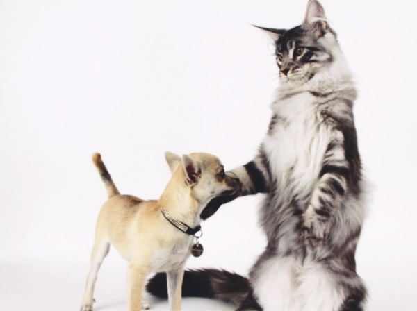 Если рассматривать взаимодействие кошки с маленькой собакой, то возникает интересный феномен межвидового общения.