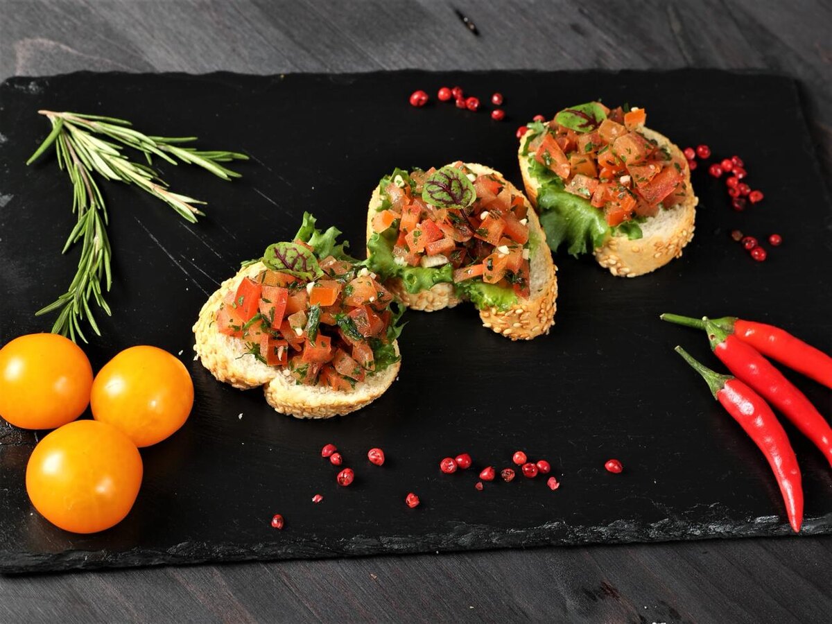 Друзья, как и многие из вас, я очень люблю итальянскую кухню. И сегодня я хочу рассказать о брускетте – традиционной закуске, в которой соединились хруст поджаренного хлеба и яркий вкус сочной многослойной начинки. Их можно приготовить и на завтрак вместо обычных бутербродов, и на обед как дополнение к первому блюду, и на ужин как изысканную закуску. 1. Для брускетты нужен хлеб, который выдержит многослойную начинку: чиабатта, багет или «деревенский». Нарежьте хлеб ломтиками толщиной 1,5–2 см и обжарьте на сковороде до золотистой корочки. Если вы начинки будет много, режьте под небольшим углом – так площадь бутерброда будет больше. 2. Отличная основа для брускетты – густой и насыщенный топпинг. Подойдет сливочный сыр, хумус и различные овощные намазки, например, на основе запеченного перца или баклажанов. 3. Брускетта должна выглядеть аппетитно, а что может быть аппетитнее, чем натуральные овощи, травы и душистые специи! Поэтому смело добавляем помидоры черри, мяту, базилик или руколу