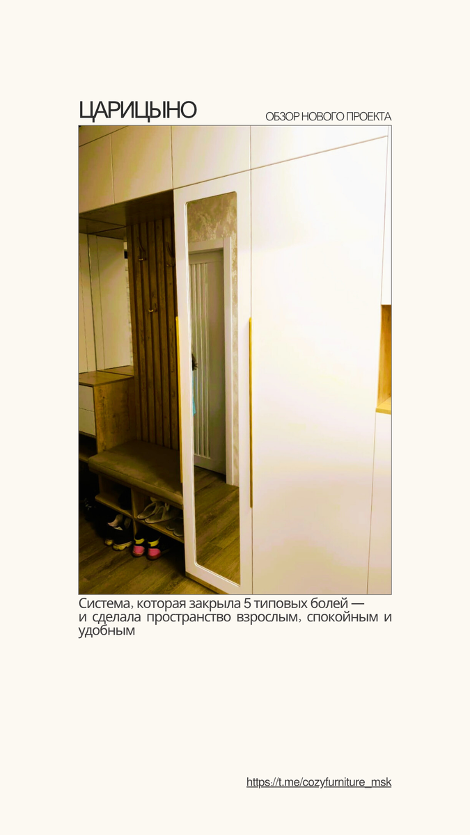 История о том, как обычная прихожая в Царицыно стала примером умного подхода к организации пространства. Когда Андрей и Яна обратились к нам, они сформулировали задачу, знакомую многим жителям типовых квартир: «Хотим, чтобы всё было под рукой, но без ощущения склада». За 170 000 рублей мы создали систему, которая решила 5 ключевых проблем. Вместо разрозненных модулей — цельная композиция от пола до потолка. Антресоль, шкаф и банкетка работают как единый организм. • Антресоль до потолка использует каждый сантиметр • Скруглённые фасады не мешают в узком проходе • Банкетка правильной высоты — удобно обуваться Глубокие антресоли, выдвижная штанга, скрытые ящики — у каждой вещи появилось своё место. ЛДСП «Дуб ирландский», МДФ ПВХ Adilet Braccio, фурнитура GTV с доводчиками — всё это гарантия долговечности. Бесшовное зеркало, система push-to-open, декоративные рейки — прихожая стала предметом гордости. «Мы и не думали, что прихожая может так преобразиться», — делятся клиенты. --- Готовы к та
