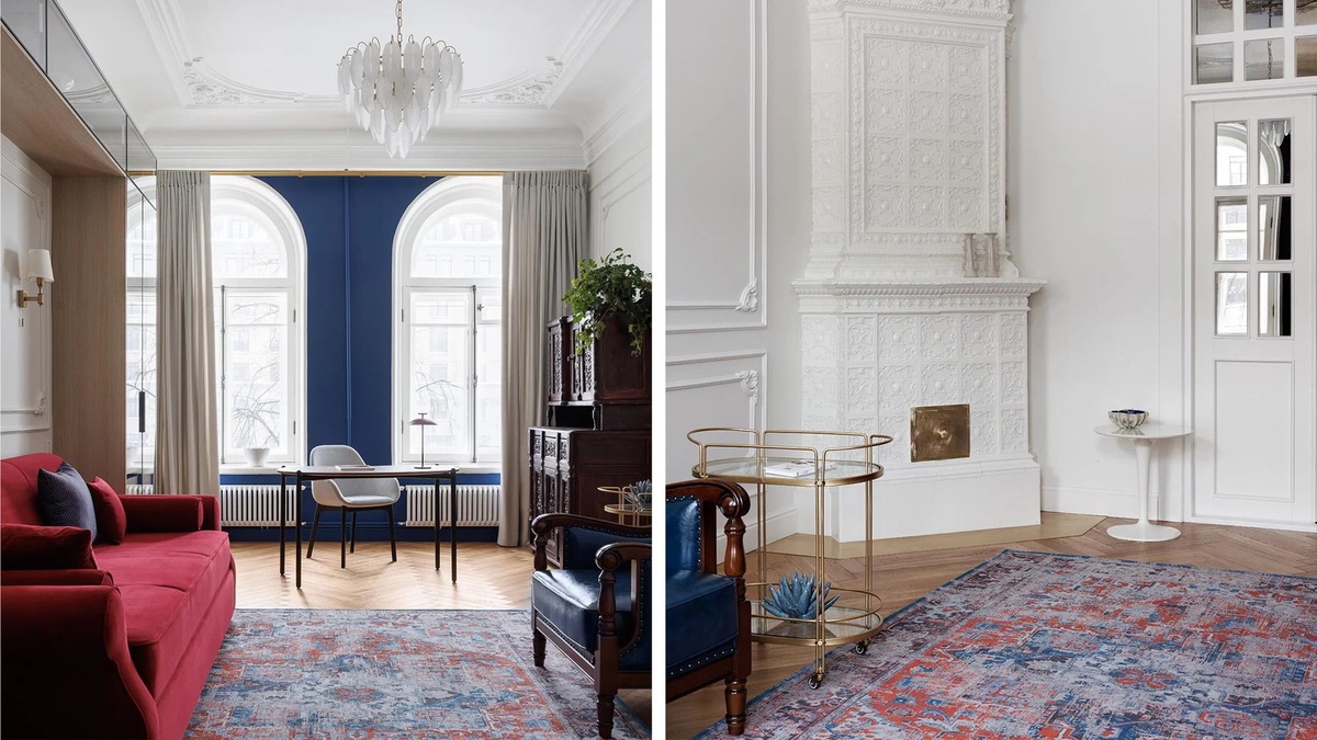 Бывшие коммунальные квартиры — не редкость в жилом фонде Санкт-Петербурга. В старом доме у реки Карповки даже сохранились детали былого величия: от лепнины до оригинальной печи с изразцами. Дизайнер Марина Светлова решила совместить современные тренды и классический стиль, а обветшавшему наследию — подарить новую жизнь. Светлый интерьер разбавляют насыщенные цветовые акценты: их роль взяли на себя выкрашенная в синий стена гостиной, уютный красный диван и яркий ковёр с «поблекшим» восточным орнаментом. Элегантности обстановке добавляет винтажная мебель из натурального дерева. Книжный шкаф, предназначенный для хранения обширной домашней библиотеки, выполнен в современном стиле. Компактно уместившись по обе стороны от дивана, он, помимо прочего, защищает старинные книги от деформации, пряча их за стеклянными дверцами. Современный комфорт — не помеха ретро-колориту. Ванная комната с позолоченными бра, мраморной плиткой и стильным зеркалом словно вышла из кино про великого Гэтсби — если бы