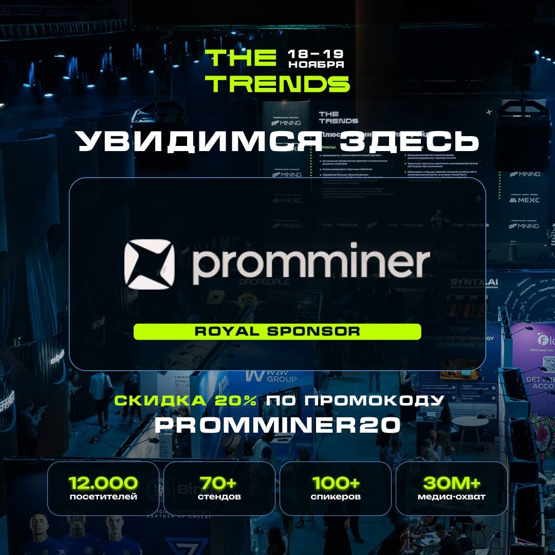 ⚡️ Завтра в Москве стартует V двухдневный международный форум-выставка THE TRENDS Мероприятие будет посвящено формированию ключевых технологических и инвестиционных трендов и объединит 12 000 участников и 120 спикеров из более чем 30 стран. 💎 Компания Promminer является Royal-спонсором форума. По нашему промокоду PROMMINER20 действует скидка 20% на покупку билетов всех категорий. 🔥 До встречи на форуме THE TRENDS! 🤍 Promminer: Сайт | ВК | YouTube | Дзен