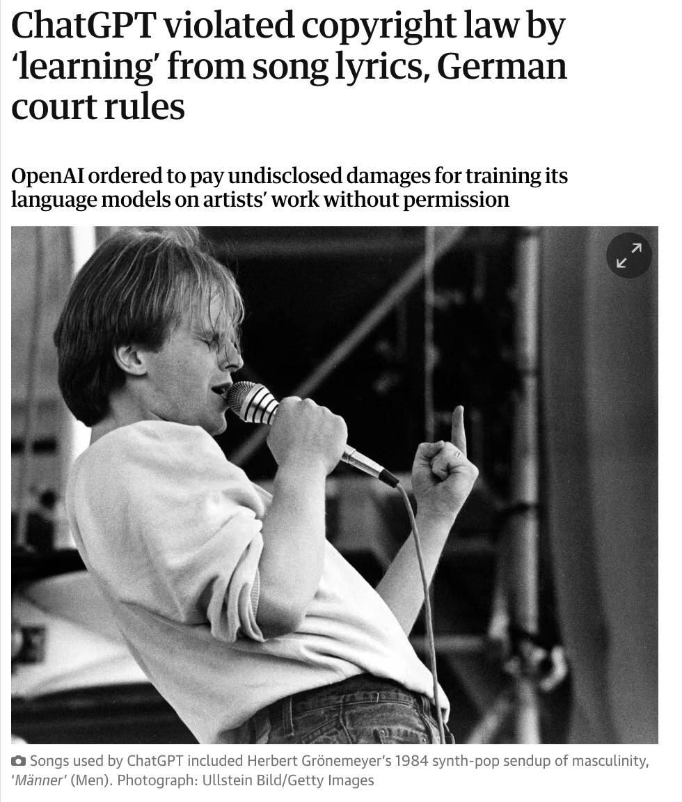 Что ж, в Германии суд признал, что OpenAI виновна в нарушении авторских прав музыкантов, так как при обучении ChatGPT без разрешения использовали тексты известных немецких авторов и исполнителей. Разбирательство продолжалось больше года и в иске девять песен. @lobushkin