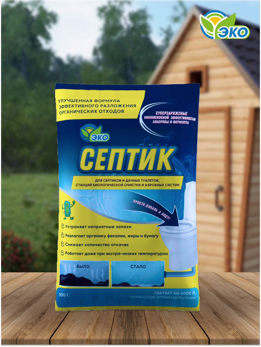 Средство состоит из анаэробных бактерий и особых ферментов, усиливающих их действие. Благодаря заряженным микроорганизмам «ЭкоСептик» справляется со своей задачей даже при минусовых температурах, чем не может похвастаться практически ни один аналог!