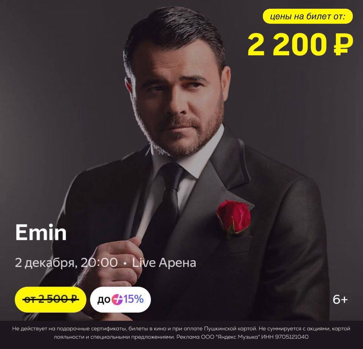 Emin — билеты уже на Яндекс Афише от 2200₽ 🔥 При покупке билетов вводите промокоды: C00397 — 500₽ на первую и все повторные покупки билетов от 3000₽ AX5681 — 10% на первую и все повторные покупки от 3000₽ B32304 — 300₽ на первую покупку билетов от 2000₽ A21138 — 100₽ на все повторные покупки билетов от 1000₽ AW423018 — 750₽ от 5000₽ для новых пользователей Реклама. ООО "ЯНДЕКС МУЗЫКА", ИНН 9705121040. erid: 2Vtzqx9KcQ9