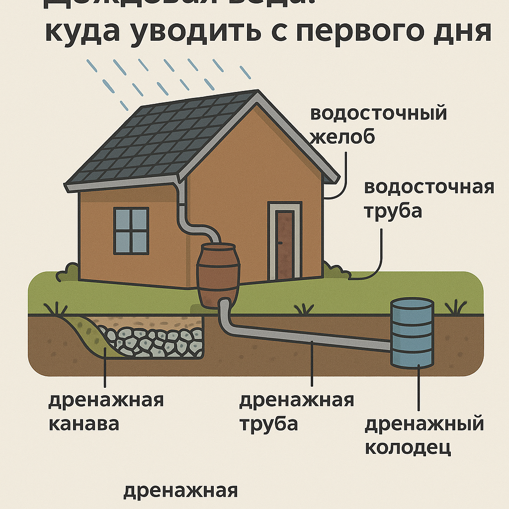 Первая гроза на стройке — и весь песок в траншеях уплыл. Без организованного водоотвода участок превращается в болото, техника вязнет, а бетон “плавает”. Ливнёвка нужна не после отделки, а с момента, когда появилась первая насыпь и котлован. 💧 Временная ливнёвка: дешево и спасает Пока нет отмостки и труб, поможет временная ливневая система.
