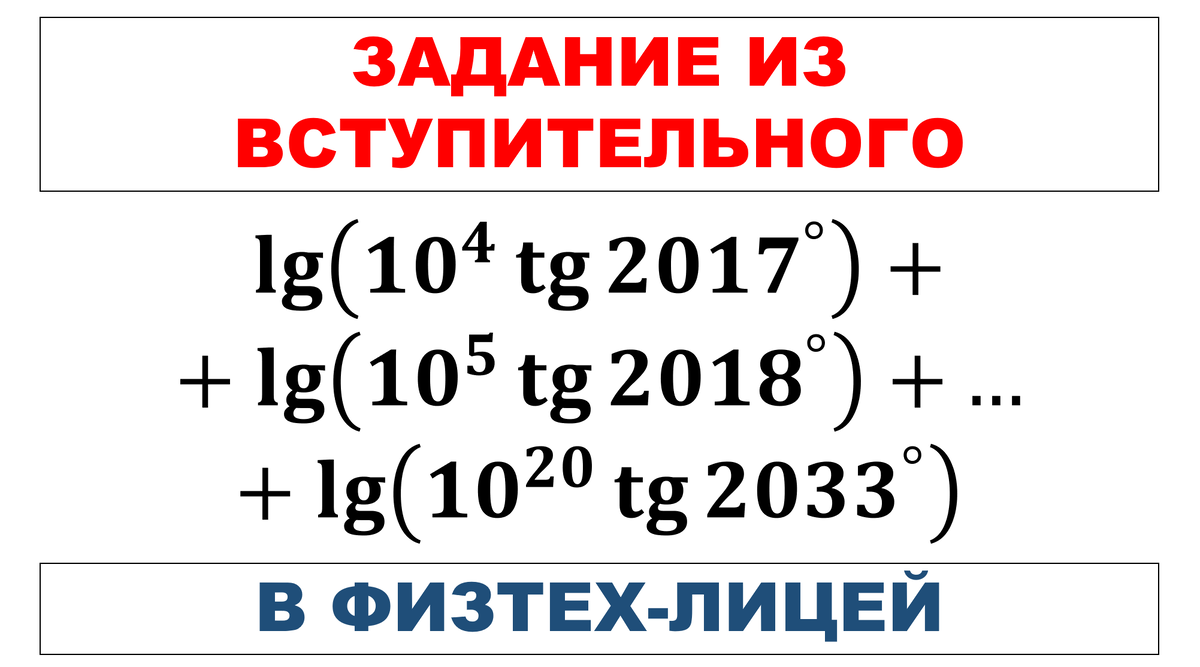 Уровень заданий, которые дают на вступительном экзамене в Физтех-лицей, вполне соответствует средней олимпиаде по математике. Основательная подготовка к такому испытанию необходима даже для тех учеников, которые отлично справляются с учебной программой по математике старшей общеобразовательной школы. Чтобы в этом убедиться, достаточно попробовать решить следующую задачу из вступительного экзамена по математике в 11 класс Физтех-лицея, который проводился в 2025 году: Найдите значение выражения: lg(10^4*tg 2017°)+lg(10^5*tg 2018°)+…+lg(10^20*tg 2033°) Перепишем выражение: Используем сперва следующую формулу приведения для уменьшения аргументов тангенсов: То есть из каждого аргумента можно вычесть число полных углов по 180°. Тогда выражение принимает вид: Далее используем стандартные свойства логарифмов для упрощения полученного выражения: Перепишем теперь некоторые аргументы тангенсов в следующем виде: И воспользуемся следующей формулой приведения: Тогда получаем выражение: В центр