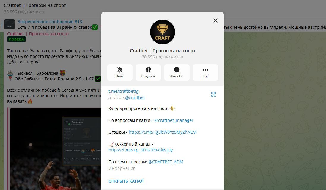 О чем канал Craftbet | Прогнозы на спорт и чем он занимается в Телеграмм