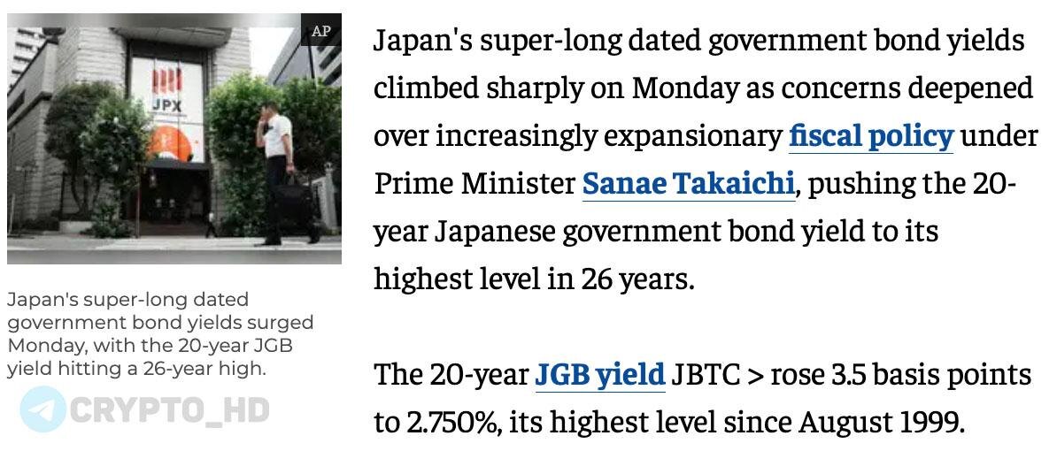 ❌🇯🇵 Политика Японии может обрушить мировые рынки… ➥ Доходность 20-летних гос. облигаций Японии обновила исторический максимум (2,75%). ➥ Правительство Японии готовит новый пакет фискальных стимулов на $110,000,000,000. ➥ Подобные меры вызывают риски повышения инфляции, увеличения долговой нагрузки, повышения доходностей облигаций – что может привести к оттоку ликвидности из рискованных активов. ➥ Картина напоминает 2018 год, когда рост доходностей японских и американских облигаций вызвал распродажи акций (❗️) и серьезную турбулентность на мировых рынках. Тогда японская экономика тоже буксовала – отдельные кварталы показывали снижение ВВП (как и в последнем отчете). ➥ Япония – крупнейший держатель иностранных активов, включая более $1,100,000,000,000 в американских гос. облигациях. Если доходности Japanese Government Bonds продолжат расти, японским инвесторам придется продавать иностранные активы. Crypto Headlines