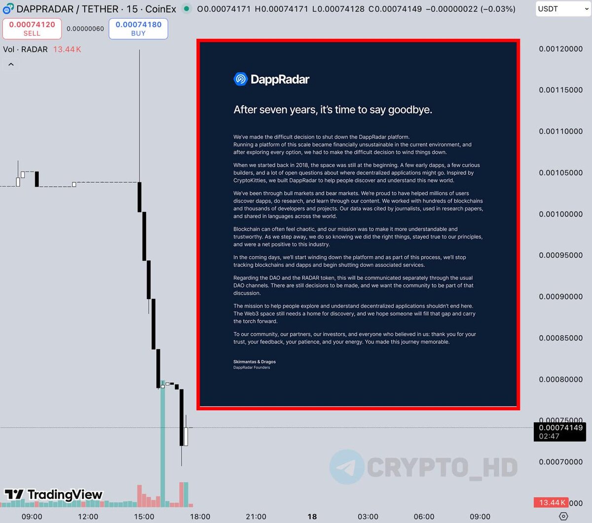 🚫 #RADAR Проект DappRadar объявил о постепенном закрытии из-за финансовых трудностей – анонс