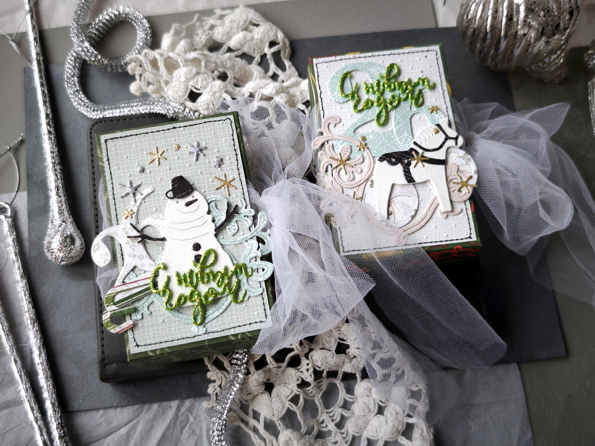 Привет, с вами Надя! После нашего коробочного сп меня у меня наступила влюбленность в коробочки! Сделала новогоднюю парочку с милейшим снеговиком - жонглером и символом года - лошадкой )) Завиток и рамочка "Страдающее средневековье" ловко имитируют снежные узоры. "Снеговика" и лошадку "Хюгге" вырубила многократно и склеила в виде объемного чипборда. "Леденцы", цифры и всю остальную вырубку сделала двухслойной, для крепости )) Добавила роскошные банты из фатина, фактуру на фон и блестящую надпись "Мои поздравления". Теперь осталось заполнить коробочки, я выбрала конфеты в роскошных обертках, три дня выбирала, те, что достойны в них оказаться ))