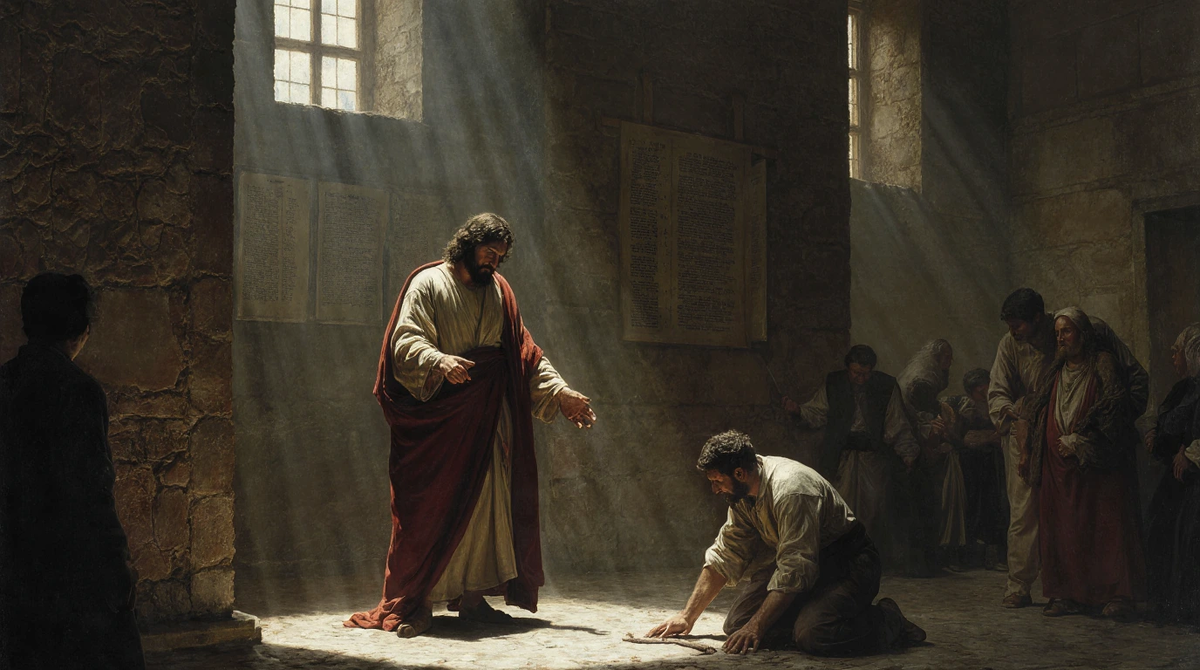 Пустынная тишина и прибрежный шум сменились торжественной прохладой синагоги. Здесь, в священной обители, воздух был пропитан ароматом вощеного дерева и древних свитков. Люди приходили сюда не за едой, а за духовным пропитанием — слушать Закон и Пророков. Субботний день. Как и подобало благочестивому иудею, Иисус вошел в синагогу и начал учить. Но с первых же слов привычный уклад был нарушен. Его учение не напоминало мерный гул цитат и мнений великих раввинов. Он не говорил: «По мнению рабби Гиллеля...» или «Как сказал рабби Шаммая...». Он учил как власть имеющий, а не как книжники. Его слова были подобны удару молота, разбивающего стены, а не ключу, открывающему дверь. Они не ссылались на авторитет, а были самим Авторитетом. Это было не толкование Закона, а провозглашение Воли Законодателя. Люди замерли в изумлении; старые свитки в руках служителей казались ожидавшими этого голоса веками. И вдруг тишину разорвал вопль. Из глубины собрания, от человека, скованного тьмой, раздался про