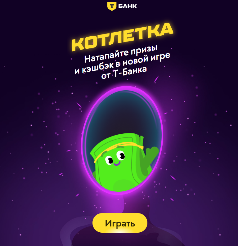 В Т-банке запустилась новая игра "Котлетка" (в прошлом году называлась Спейс Инвесторс) Срок действия игры: с 17 ноября по 17 декабря 2025 года Главный розыгрыш будет проведен 13 января 2026 года. Чтобы стать участником главного розыгрыша нужно будет занимать призовые места в лигах. За это вы получите призы и билет на розыгрыш. Всего можно собрать 4 билета - чем их больше, тем выше шанс на победу. Что можно выиграть В главном розыгрыше общий призовой фонд - 2 млн рублей. Его разделят 15 человек: 1 победитель получит 500к, 4 победителя по 250к, 10 победителей по 50к рублей. Если хотите в команду Сороки, присоединяйтесь по коду M6Q1-CUQE Ссылка на игру Ссылки на правила пока недоступны((