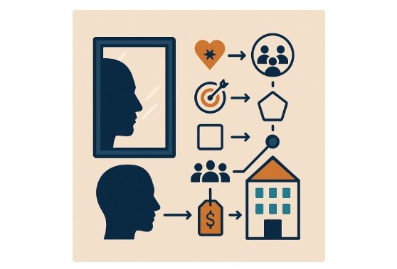 Возьмём за аксиому: бизнес — это отражение психологического портрета владельца. Речь прежде всего о микро- и малом бизнесе с мажоритарным владельцем. Многие видели это вживую: внутренние установки владельца переходят в управленческие решения и в то, как компания создаёт ценность для клиентов: Мне особенно важен взгляд через призму ценности. Цепочка выглядит так: психологический портрет задаёт ценности человека; ценности формируют решения про цели для бизнеса; цели определяют уровень амбиций команды; амбиции влияют на выбор клиентских сегментов; выбранные сегменты направляют ценностные предложения для клиентов.