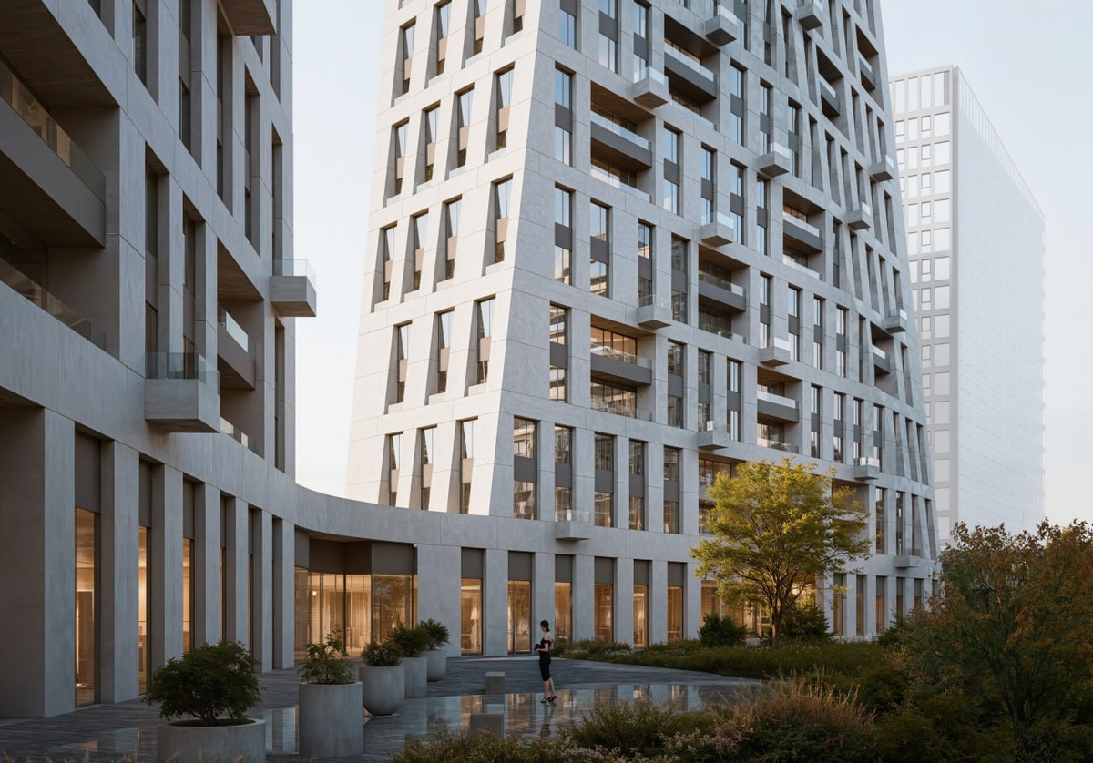 Высота домов — до 78 метров, выразительная пластика фасадов, крупные оконные проёмы, акцент на визуальном ритме. Для района Можайский такой архитектурный жест — событие. Здесь давно не появлялось проектов с амбициями стать архитектурным ориентиром. 🔽🔽🔽🔽🔽
