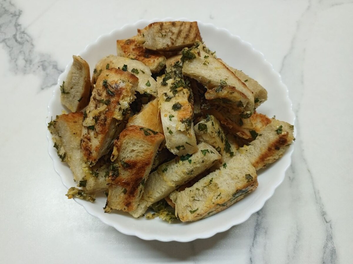 Чеснок нарезать мелко (чтобы не горел в духовке, лучше резать, а не пропускать через пресс). Петрушку или укроп также нарезать мелко. Соединить вместе с растительным маслом. Сыр натереть на мелкой терке. Хлеб нарезать длинными брусочками. Буханку хлеба нарезать брусочками. Застелить противень пергаментом, чтобы были борта. Выложить кусочки хлеба на противень, сверху вылить масло с чесноком и петрушкой, выложить сыр. Перемешать все аккуратно руками в перчатках, разровнять. Для цвета можно добавить 1/2 ч.л паприки или куркумы, можно 1/2 ч.л. измельченных сушеных помидоров. Запекать в духовке при 180-200°С в течение 15-25 минут. Время зависит от свежести буханки хлеба. Я сегодня испекла хлеб, поэтому ему потребуется больше времени для того, чтобы подсушиться. Кстати, в процессе запекания сухарики можно и нужно перемешать 1-2 раза. Хлеб можно брать любой: пшеничный, серый, ржаной... Получаются нереально вкусные и очень ароматные сухарики, хорошо хрустят на зубах. При просмотре сериала - с