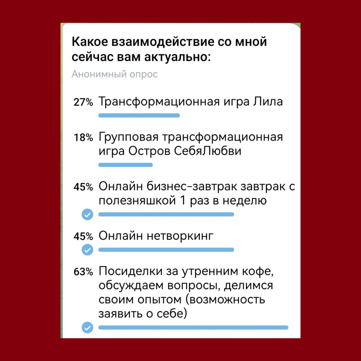 Ребята, если встреча "Посиделка за утренним кофе и обсуждение вопросов, делиться опытом" не актуальна, тогда я её не буду планировать на среду. Если все же вы проголосовали за такой вариант встречи, то давайте определяться со временем. Просьба проголосовать в опросе выше. ⬆️⬆️⬆️⬆️⬆️ Мероприятие бесплатное. Это возможность для вас познакомиться с новыми людьми, поделиться своим мнением и опытом, заявить о себе в поддерживающем сообществе. Тему для обсуждения я решила взять "Что вас больше всего драйвит/мотивирует на рост, развитие и изменения ?"