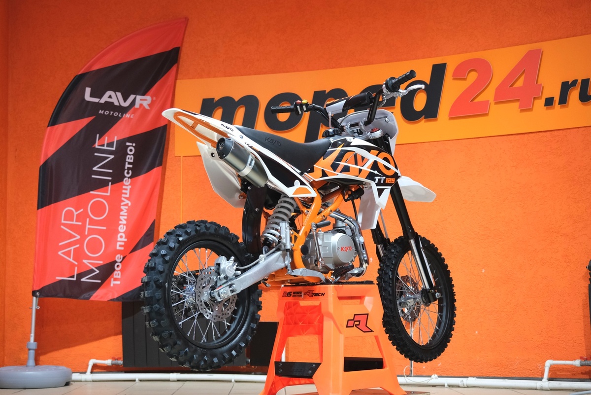 KAYO BASIC TT125 – одна из самых популярных моделей в ряду мототехники известного производителя. Доступный и надежный питбайк создан для тех, кто любит адреналин и активный отдых. Также этот спортивный снаряд станет отличным напарником для всех, кто делает первые шаги во внедорожном мотоспорте. В обновленной раме типа Evolution стоит один из самых надежных малокубатурных двигателей «кабовского» типа: одноцилиндровый 4-тактник YX153FMI с 4-ступенчатой коробкой передач. Мотор воздушного охлаждения работает с карбюратором NIBBI PE19, что позволяет силовому агрегату выдавать 11 лошадиных сил максимальной мощности. Запуск двигателя осуществляется при помощи рычага кик-стартера. Ходовая часть питбайка KAYO BASIC TT125 представлена классическим конструктивом: колесной формулой 17/14 дюймов, а также нерегулируемыми телескопической вилкой длиной 735 миллиметров спереди и маятниковым рычагом с моноамортизатором длиной 360 миллиметров сзади. Подвеска рассчитана на большинство сценариев исполь