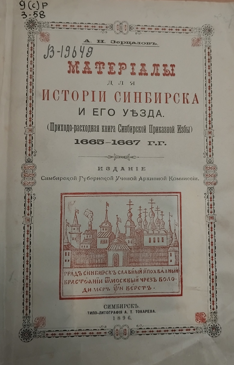 К счастью, до наших дней сохранился другой не менее ценный источник – «Приходно-расходная книга Синбирской приказной избы» 1665–1667 гг. обнаруженный в делах архива министерства юстиций дореволюционным краеведом А.Н. Зерцаловым (опубликован отдельным изданием в Симбирске в 1896 г.). В связи с тем, что главной целью составления приходно-расходных книг была фиксация налоговых поступлений (ясачных и окладных сборов) и расходов в уезде, в этих документах подробно описывались группы тяглого населения. Кроме того, в книги вносились и служилые люди, а также духовенство бравшие в аренду у государства промысловые и иные владения за выплату в казну фиксированного оброка.
