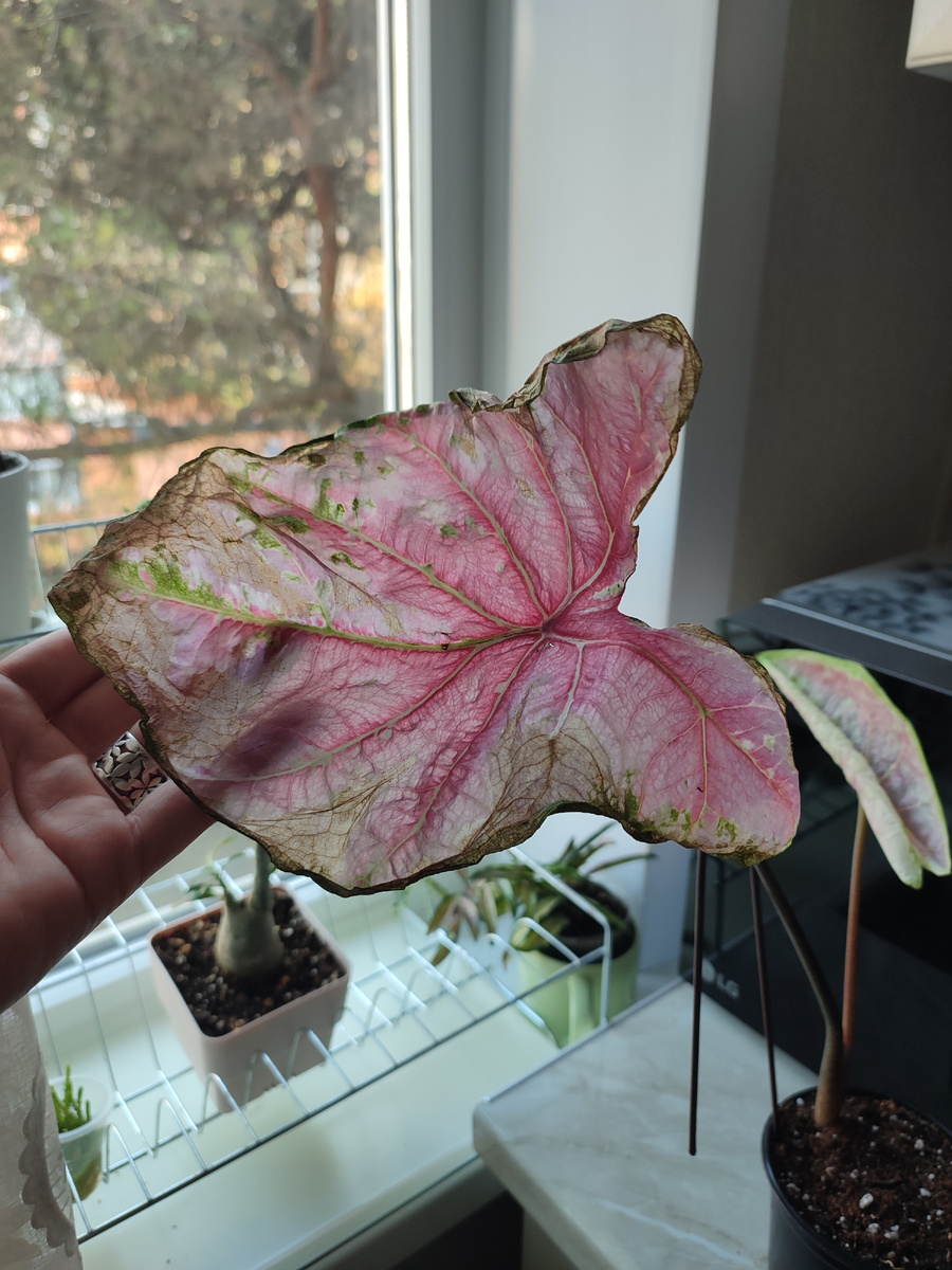 Ну что бы я делала без вас, девочки! Обмолвилась в видео о том, что ищу с октября в "пятерочках" обещанные Каладиумы от Горкунова, а их все нету, в комментариях посоветовали сходить в "светофор"... И хоть в нашем "светофоре" я не встречала ничего кроме полутора крашеных кактусов, да и путь до него далек, я таки решила сходить проверить. И вуаля! Там была целая поляна растений и среди них штук 10 каладиумов! Ну плюс-минус. Правда все они как будто всходы одного опыления, вроде разные, а вроде одинаковые, ну и состояние очень не очень, залиты, стоят в холоде и темноте... Но все это не меняет сути, это Каладиум и я его хочу! И я его взяла. Риск же вроде всё ещё благородное дело? Да и цена приятная. А вот и он! На известные мне сорта не похож, но красавчик же! Лист полупрозрачный, как я люблю, сочетание розового и салатового. Красиво. Лист порченый, такие были все. У кого единственный лист, у кого один плюс один в зачатке. Взяла с зачатком. Молодой лист был белесый, бесцветный, явно вырос