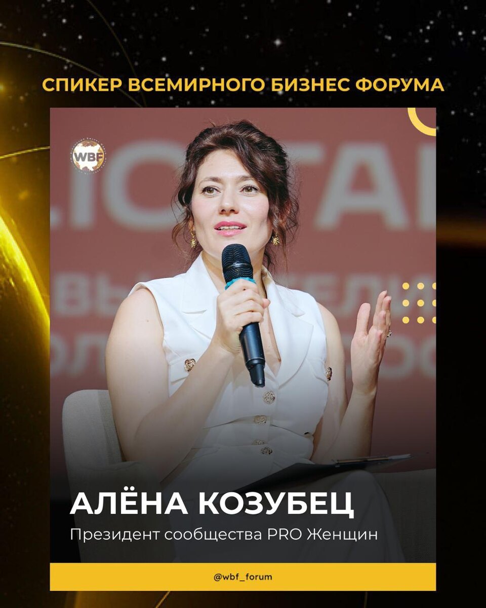 Президент сообщества PRO Женщин Алена Козубец — спикер Всемирного Бизнес Форума. Дорогие, с 14 по 21 ноября проходит Всемирный Бизнес Форум — первое деловое мероприятие в мире, которое продлится семь суток без перерыва: 168 часов вещания и каждый час выступает новый спикер. Среди спикеров — предприниматели, чьи проекты вошли в списки Forbes, руководители сообществ и творческих коллективов, представители власти, люди искусства. Для нас всех особенно важно выступление Президента сообщества PRO Женщин Алены Козубец. Оно пройдет завтра, 18 ноября, в 16:00 по Москве. Тема: «Инструменты корпоративной культуры». 🌎 Форум пройдет в формате онлайн-трансляции и будет доступен для предпринимателей из разных уголков нашей страны и мира. Участие бесплатное. 🔗 Подробная программа и детали о мероприятии — по ссылке worldwidebusinessforum.com.