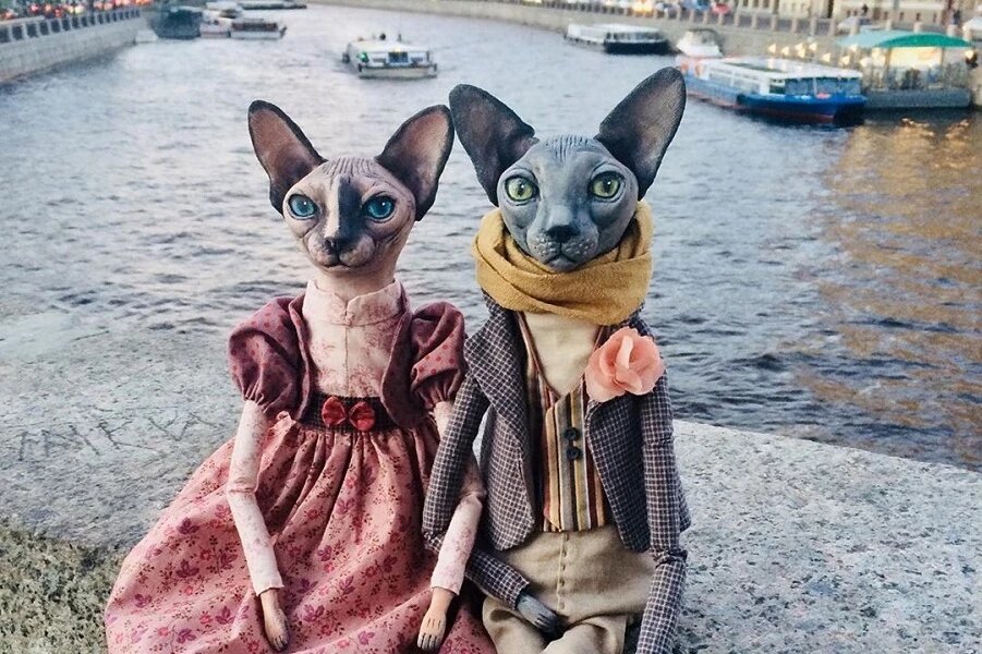 Елена Алехина, талантливый мастер кукольного искусства, создает уникальных сфинксов. Вот, что считает сама Елена, как автор работ. Когда живешь в Петербурге невозможно не использовать его потрясающие декорации. Куклы, которые создает мастер делаются с использованием комбинированной техники. Голова и конечности выполнены из пластика, лапки изготовлены из ткани, а туловище обладает мягкой текстурой и наполнено синтепоном и галькой.
