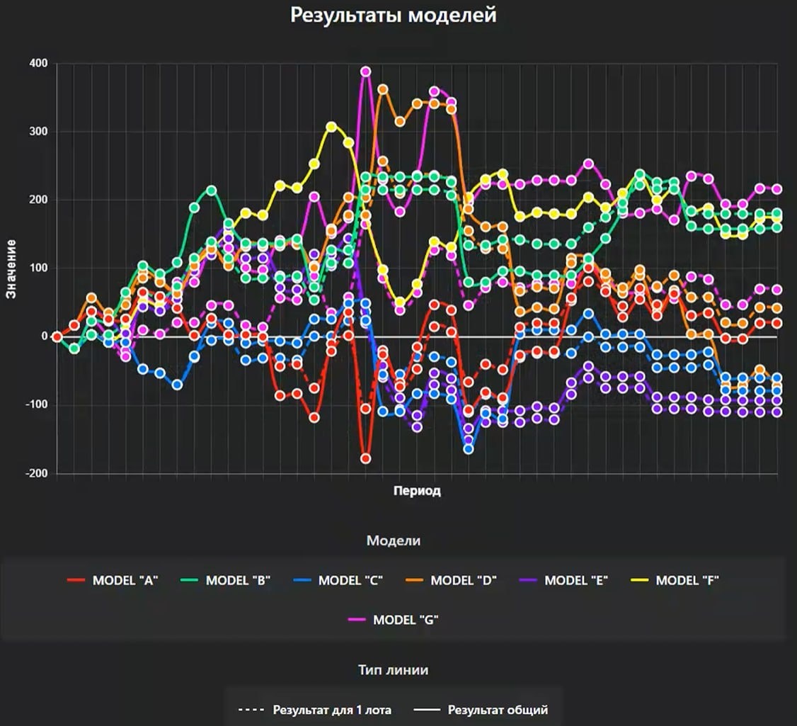 📊 17.11.2025 ┌──────┬────────┬──────┬────┬────────┬────────┐ │МОДЕЛЬ│ПРОГНОЗ │ ВЕР. │ЛОТ │ 1 ЛОТ │ ИТОГ │ ├──────┼────────┼──────┼────┼────────┼────────┤ │ A │ Ниже↓ │ 0.58 │ 0 │ 0 │ 0 │ │ B │ Выше↑ │ 0.63 │ 2 │ 1 │ 2 │ │ C │ Ниже↓ │ 0.82 │ 2 │ -1 │ -2 │ │ D │ Ниже↓ │ 0.65 │ 1 │ -1 │ -1 │ │ E │ Ниже↓ │ 0.60 │ 1 │ -1 │ -1 │ │ F │ Выше↑ │ 0.70 │ 2 │ 1 │ 2 │ │ G │ Ниже↓ │ 0.75 │ 1 │ -1 │ -1 │ └──────┴────────┴──────┴────┴────────┴────────┘ Результаты с 15.09.2025 по 17.11.2025 📅 ┌────────────┬───────┬────────┐ │ Модель │ 1 лот │ Общий │ ├────────────┼───────┼────────┤ │ MODEL "A" │ 20 │ 20 │ │ MODEL "B" │ 181 │ 160 │ │ MODEL "C" │ -80 │ -62 │ │ MODEL "D" │ 42 │ -72 │ │ MODEL "E" │ -111 │ -94 │ │ MODEL "F" │ 174 │ 175 │ │ MODEL "G" │ 69 │ 216 │ └────────────┴───────┴────────┘
