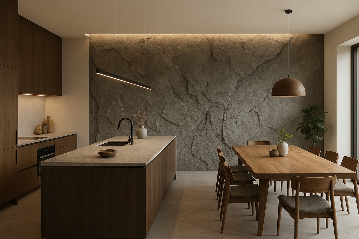 Однако, чтобы интерьер не стал плоским, дизайнеры усиливают его фактурой: бархатной штукатуркой, фактурными панелями, рельефными декоративными элементами. Чем глубже поверхность, тем благороднее выглядит пространство. Это особенно заметно в тренде на «спокойную роскошь», где не нужна яркость — достаточно ощущения качества.