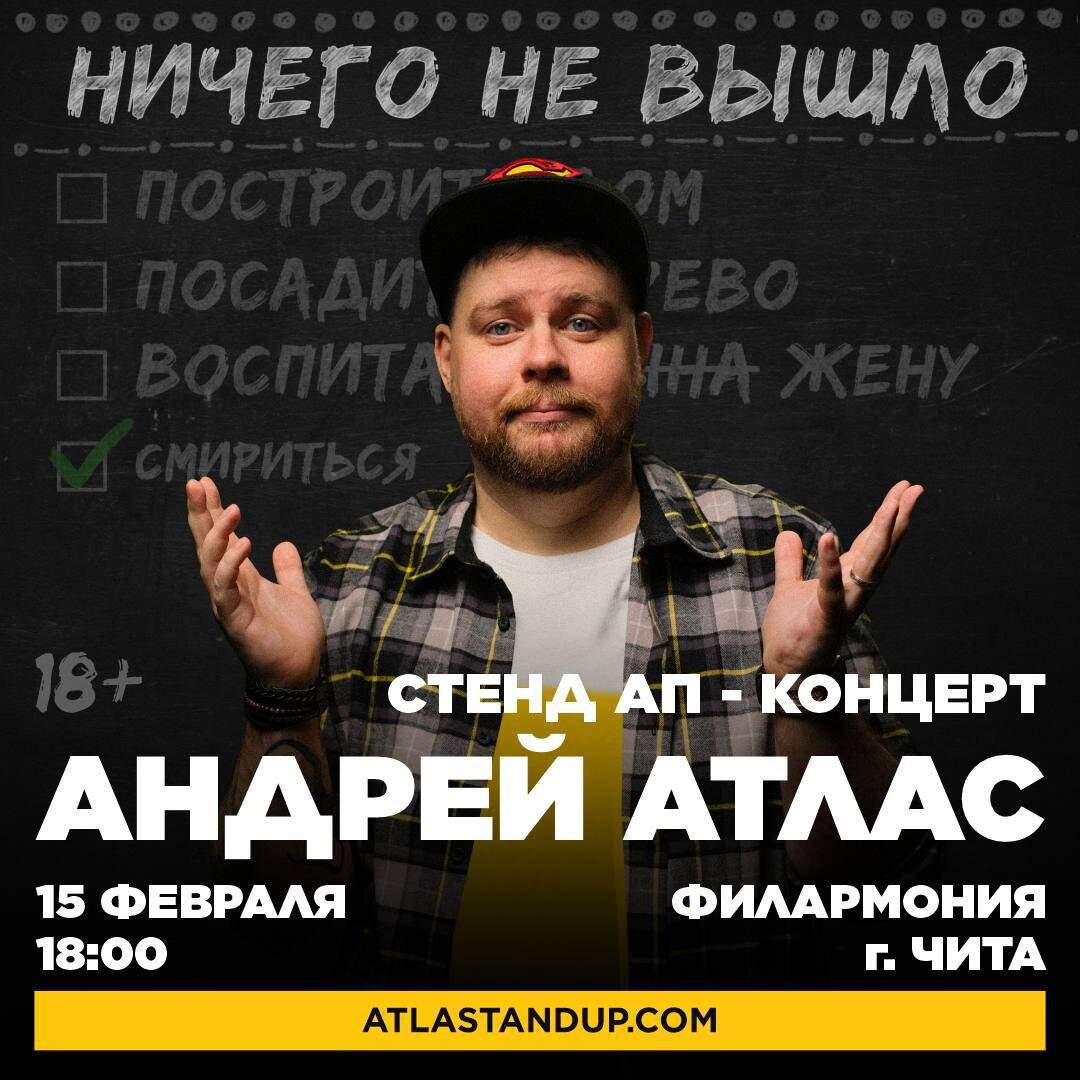 Андрей Атлас: стендап-концерт «Ничего не вышло»! Комик расскажет про состояние, знакомое каждому: на работе, в личной жизни, в мечтах и даже в мечтах о романе прямо в офисе. Андрей поделится личными историями и на своём опыте покажет, что ждёт после этой мысли и как быстро найти в ней позитив. 🕐15 февраля, 19.00 📍Забайкальская краевая Филармония 🪙 от 1200 до 2700 рублей 🔑Билеты можно купить тут #Новости Предложить публикацию:@zabkulisye_bot